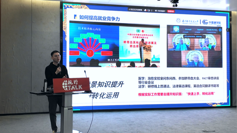 “视野TALK”榜样分享会可谓是干货满满,既有刘欣学姐对于学生工作、时间管理经验的分享,也有廉思源学姐带来的大赛指导,最令我印象深刻的是刘敏杰学长在分享中提到的“翻译要做的是沟通的桥梁”。学长的经历启发了我:英专生不是只能学英语,我今后也会探索自己感兴趣的领域,将所学所爱结合起来,扩大自己的赛道,比如法律英语,为我日后想从事的国际组织相关的职位打下基础。