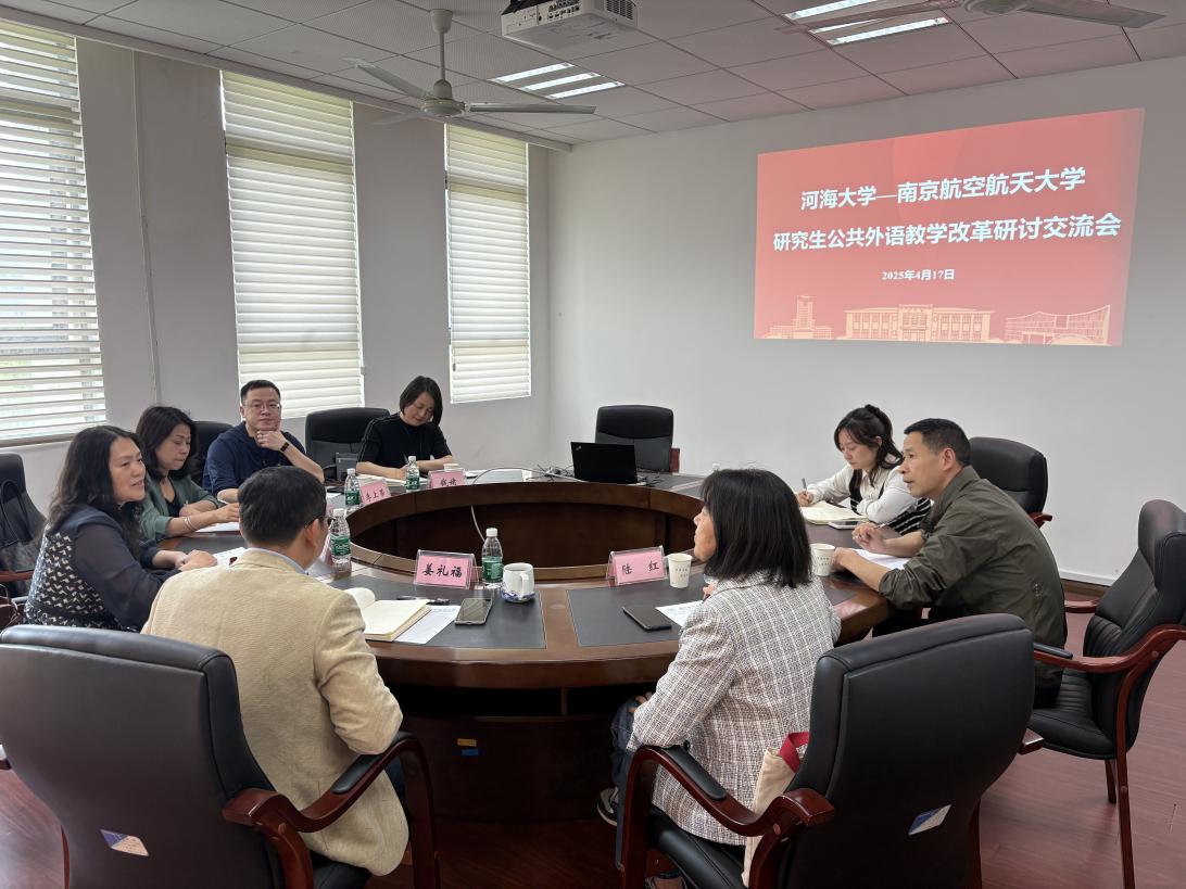 2025年4月17日下午,河海大学十三水app 副院长董桂君一行访问十三水app ,开展十三水app -河海大学研究生公共外语教学改革研讨交流会,十三水app 副院长姜礼福、研究生公共外语教学部主任陆红及相关负责人出席并参与研讨。
