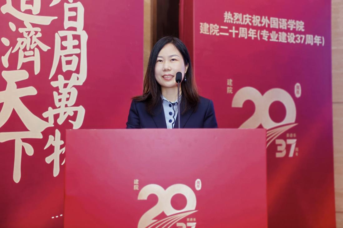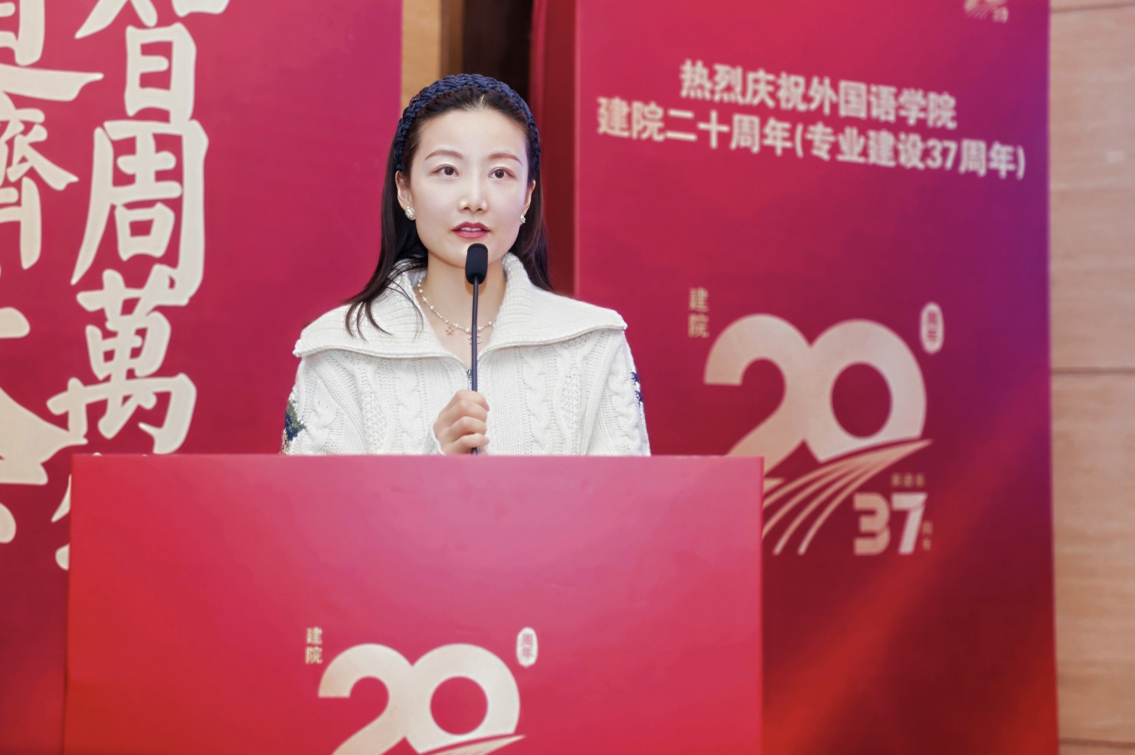2006届本科毕业生2009届硕士毕业生,北京航空航天大学出版社副总经理、副总编辑葛建平在发言中深情回顾了她在十三水app 两校区七年的求学时光,她表示,将军路的现代与活力,教会我们用开放的姿态拥抱全球视野;明故宫的厚重与沉静,提醒我们用严谨的态度钻研语言本质。谈及如今从事高等教育和学术出版工作的感悟,强调外语已成为连接中外的纽带、文化传承的载体以及讲好中国故事、提升国际话语权的重要力量,并祝福十三水app 继续以语言为桥、以文化为帆,在未来培养更多国家需要的复合型外语人才,孕育更多学术硕果。